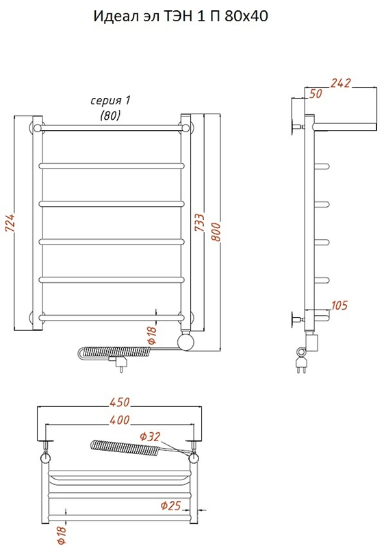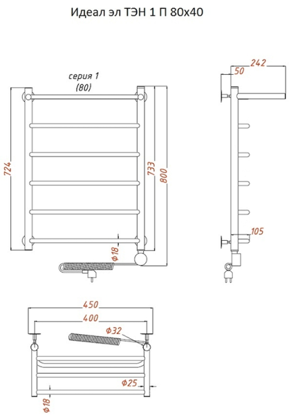 Внимание! Для скрытого монтажа электропроводки необходимо приобрести комплект скрытого подключения.Полотенцесушитель электрический комплектуется ТЭНом с терморегулятором и таймером.Изделие производится из нержавеющей стали AISI 201. Вертикальные трубы d -32 мм., для горизонтальных вставок используется труба d — 18 мм.Нагревательным элементом в полотенцесушителе является ТЭН. Полотенцесушитель заполнен бытовым антифризомЭкономичность: ТЭН нагревает антифриз до нужной температуры и выключается, далее при остывании полотенцесушителя он включается опять. Таким образом он работает не постоянно и получается, что ТЭН потребляет электричество не 300 Вт, а порядка 100 — 150 ВтМощность электрического прибора порядка 100 Вт при стоимости 1 Вт — 5 руб несложно посчитать: 100Вт х 24 = 2,4 кВт в сутки. Стоимость эксплуатации изделия за сутки 2,4 кВт х 5 руб. = 12 руб. При максимальной температуре расход электричества за 30 дней составит порядка 360 руб. При условии если сушка работает круглосуточно на максимальной температуре.Удобство монтажа: Полотенцесушитель крепится к стене на четыре держателя. Изначально ТЭН не установлен в полотенцесушитель для безопасной транспортировки, его можно установить, как справа, так и слева предварительно перевернув полотенцесушитель вверх ногами и выкрутив заглушку с нужной стороны на место в которое установится ТЭН.Примечание. Внимательно изучите инструкцию по установке ТЭНа!Скрытое подключение: Для скрытого монтажа электропроводки необходимо приобрести комплект скрытого подключения.Подключение в розетку: В комплекте с ТЭНом имеется шнур с вилкой, который будет необходим при подключении к розетке.