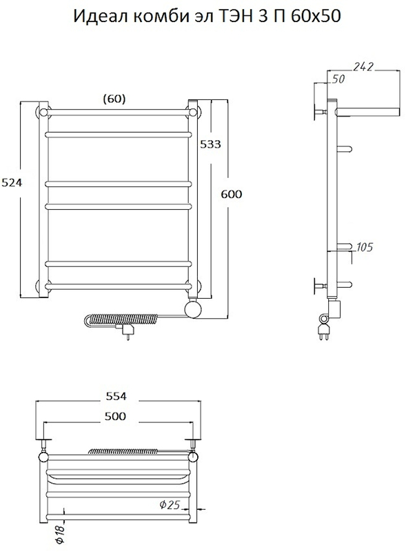 Внимание! Для скрытого монтажа электропроводки необходимо приобрести комплект скрытого подключения.Полотенцесушитель электрический комплектуется ТЭНом с терморегулятором и таймером.Изделие производится из нержавеющей стали AISI 201. Вертикальные трубы d -32 мм., для горизонтальных вставок используется труба d — 18 мм.Нагревательным элементом в полотенцесушителе является ТЭН. Полотенцесушитель заполнен бытовым антифризомЭкономичность: ТЭН нагревает антифриз до нужной температуры и выключается, далее при остывании полотенцесушителя он включается опять. Таким образом он работает не постоянно и получается, что ТЭН потребляет электричество не 300 Вт, а порядка 100 — 150 ВтМощность электрического прибора порядка 100 Вт при стоимости 1 Вт — 5 руб несложно посчитать: 100Вт х 24 = 2,4 кВт в сутки. Стоимость эксплуатации изделия за сутки 2,4 кВт х 5 руб. = 12 руб. При максимальной температуре расход электричества за 30 дней составит порядка 360 руб. При условии если сушка работает круглосуточно на максимальной температуре.Удобство монтажа: Полотенцесушитель крепится к стене на четыре держателя. Изначально ТЭН не установлен в полотенцесушитель для безопасной транспортировки, его можно установить, как справа, так и слева предварительно перевернув полотенцесушитель вверх ногами и выкрутив заглушку с нужной стороны на место в которое установится ТЭН.Примечание. Внимательно изучите инструкцию по установке ТЭНа!Скрытое подключение: Для скрытого монтажа электропроводки необходимо приобрести комплект скрытого подключения.Подключение в розетку: В комплекте с ТЭНом имеется шнур с вилкой, который будет необходим при подключении к розетке.