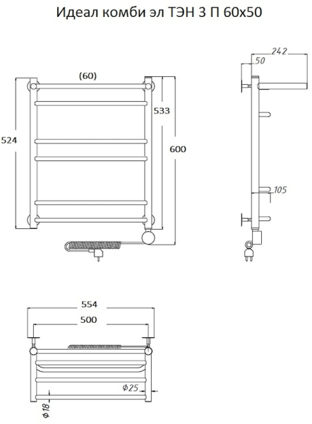 Электрический полотенцесушитель Тругор Идеал комби 3 П с полкой 60x50см хром Идеал/комби3/элТЭН6050П