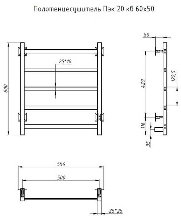 ПЭК — Полотенцесушитель электрический кабельный. Изделие производится из нержавеющей стали AISI 201. Вертикальные трубы d -32 мм., для горизонтальных вставок используется труба d — 18 мм.Нагревательным элементом в полотенцесушителе является греющий кабель — аналог «теплого пола», кабель заправляется внутрь каждой трубы и передает тепло на поверхность изделия. Во включенном состоянии постоянно поддерживается температура 50-600.Экономичность: Полотенцесушитель снабжен панелью управления. Кнопка включения/выключения и таймер на 2 часа и 4 часа, который позволяет включать изделие на ограниченное время. Эта функция дает возможность экономить электричество.Мощность электрического прибора порядка 60W при стоимости 1 кВт — 5 руб несложно посчитать: 60W х 24 = 1,5 кВт в сутки. Стоимость эксплуатации изделия за сутки 1,5 кВт х 5 руб. = 7,5 руб. Максимальный расход электричества за месяц примерно 225 руб. При условии если сушка работает круглосуточно.Удобство монтажа: Полотенцесушитель крепится к стене на четыре держателя. Универсальное исполнение изделия позволяет подключить его, как справа, так и слева.Скрытое подключение: Благодаря приваренным в нижней части вертикальных труб двум распаячным коробкам, в которых соединяется электропроводка, возможно скрытое подключение к электричеству слева и справа.Подключение в розетку: В комплекте также имеется шнур с вилкой, который будет необходим при подключении к розетке.Панель включения:РЕЖИМ №1 — постоянный нагревРЕЖИМ №2 — работа в течение 2 часов с последующим отключением.РЕЖИМ №3 — работа в течение 4 часов с последующим отключением.