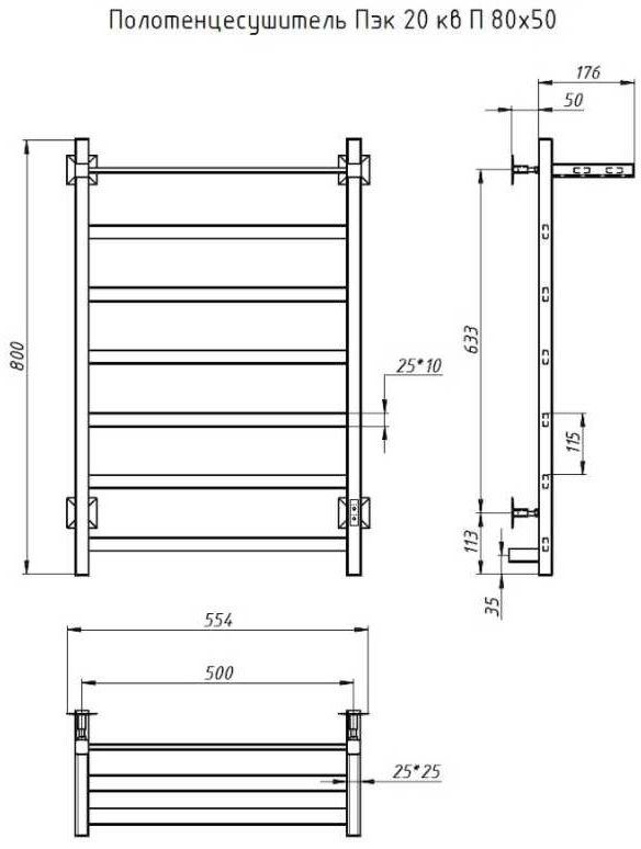 Внимание! Для скрытого монтажа электропроводки необходимо приобрести комплект скрытого подключения. Полотенцесушитель электрический комплектуется ТЭНом с терморегулятором и таймером. Изделие производится из нержавеющей стали AISI 201. Вертикальные трубы d -32 мм., для горизонтальных вставок используется труба d — 18 мм. Нагревательным элементом в полотенцесушителе является ТЭН. Полотенцесушитель заполнен бытовым антифризом.Экономичность: ТЭН нагревает антифриз до нужной температуры и выключается, далее при остывании полотенцесушителя он включается опять. Таким образом он работает не постоянно, и получается, что ТЭН потребляет электричество не 300 Вт, а порядка 100 — 150 Вт.Мощность электрического прибора порядка 100 Вт при стоимости 1 Вт — 5 руб несложно посчитать: 100Вт х 24 = 2,4 кВт в сутки. Стоимость эксплуатации изделия за сутки 2,4 кВт х 5 руб. = 12 руб. При максимальной температуре расход электричества за 30 дней составит порядка 360 руб. При условии если сушка работает круглосуточно на максимальной температуре.Удобство монтажа: Полотенцесушитель крепится к стене на четыре держателя. Изначально ТЭН не установлен в полотенцесушитель для безопасной транспортировки, его можно установить, как справа, так и слева предварительно перевернув полотенцесушитель вверх ногами и выкрутив заглушку с нужной стороны на место в которое установится ТЭН.Примечание. Внимательно изучите инструкцию по установке ТЭНа!Скрытое подключение: Для скрытого монтажа электропроводки необходимо приобрести комплект скрытого подключения.Подключение в розетку: В комплекте с ТЭНом имеется шнур с вилкой, который будет необходим при подключении к розетке.
