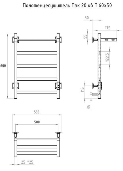 ПЭК — Полотенцесушитель электрический кабельный. Изделие производится из нержавеющей стали AISI 201. Вертикальные трубы d -32 мм., для горизонтальных вставок используется труба d — 18 мм.Нагревательным элементом в полотенцесушителе является греющий кабель — аналог «теплого пола», кабель заправляется внутрь каждой трубы и передает тепло на поверхность изделия. Во включенном состоянии постоянно поддерживается температура 50-600.Экономичность: Полотенцесушитель снабжен панелью управления. Кнопка включения/выключения и таймер на 2 часа и 4 часа, который позволяет включать изделие на ограниченное время. Эта функция дает возможность экономить электричество.Мощность электрического прибора порядка 60W при стоимости 1 кВт — 5 руб несложно посчитать: 60W х 24 = 1,5 кВт в сутки. Стоимость эксплуатации изделия за сутки 1,5 кВт х 5 руб. = 7,5 руб. Максимальный расход электричества за месяц примерно 225 руб. При условии если сушка работает круглосуточно.Удобство монтажа: Полотенцесушитель крепится к стене на четыре держателя. Универсальное исполнение изделия позволяет подключить его, как справа, так и слева.Скрытое подключение: Благодаря приваренным в нижней части вертикальных труб двум распаячным коробкам, в которых соединяется электропроводка, возможно скрытое подключение к электричеству слева и справа.Подключение в розетку: В комплекте также имеется шнур с вилкой, который будет необходим при подключении к розетке.Панель включения:РЕЖИМ №1 — постоянный нагревРЕЖИМ №2 — работа в течение 2 часов с последующим отключением.РЕЖИМ №3 — работа в течение 4 часов с последующим отключением.