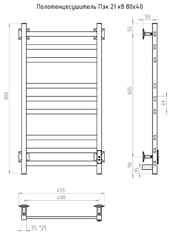 ПЭК — Полотенцесушитель электрический кабельный. Изделие производится из нержавеющей стали AISI 201. Вертикальные трубы d -32 мм., для горизонтальных вставок используется труба d — 18 мм.Нагревательным элементом в полотенцесушителе является греющий кабель — аналог «теплого пола», кабель заправляется внутрь каждой трубы и передает тепло на поверхность изделия. Во включенном состоянии постоянно поддерживается температура 50-600.Экономичность: Полотенцесушитель снабжен панелью управления. Кнопка включения/выключения и таймер на 2 часа и 4 часа, который позволяет включать изделие на ограниченное время. Эта функция дает возможность экономить электричество.Мощность электрического прибора порядка 60W при стоимости 1 кВт — 5 руб несложно посчитать: 60W х 24 = 1,5 кВт в сутки. Стоимость эксплуатации изделия за сутки 1,5 кВт х 5 руб. = 7,5 руб. Максимальный расход электричества за месяц примерно 225 руб. При условии если сушка работает круглосуточно.Удобство монтажа: Полотенцесушитель крепится к стене на четыре держателя. Универсальное исполнение изделия позволяет подключить его, как справа, так и слева.Скрытое подключение: Благодаря приваренным в нижней части вертикальных труб двум распаячным коробкам, в которых соединяется электропроводка, возможно скрытое подключение к электричеству слева и справа.Подключение в розетку: В комплекте также имеется шнур с вилкой, который будет необходим при подключении к розетке.Панель включения:РЕЖИМ №1 — постоянный нагревРЕЖИМ №2 — работа в течение 2 часов с последующим отключением.РЕЖИМ №3 — работа в течение 4 часов с последующим отключением.