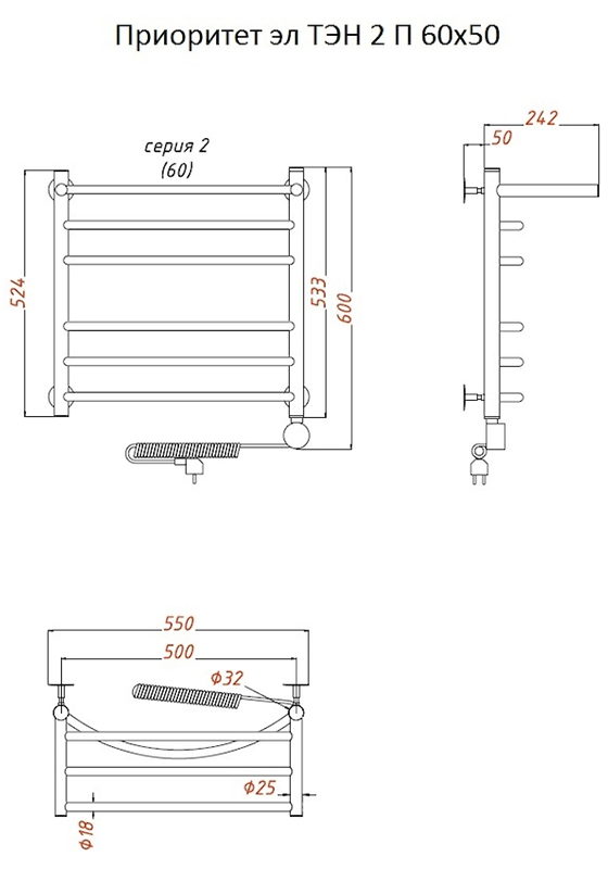 Внимание! Для скрытого монтажа электропроводки необходимо приобрести комплект скрытого подключения.Полотенцесушитель электрический комплектуется ТЭНом с терморегулятором и таймером.Изделие производится из нержавеющей стали AISI 201. Вертикальные трубы d -32 мм., для горизонтальных вставок используется труба d — 18 мм.Нагревательным элементом в полотенцесушителе является ТЭН. Полотенцесушитель заполнен бытовым антифризомЭкономичность: ТЭН нагревает антифриз до нужной температуры и выключается, далее при остывании полотенцесушителя он включается опять. Таким образом он работает не постоянно и получается, что ТЭН потребляет электричество не 300 Вт, а порядка 100 — 150 ВтМощность электрического прибора порядка 100 Вт при стоимости 1 Вт — 5 руб несложно посчитать: 100Вт х 24 = 2,4 кВт в сутки. Стоимость эксплуатации изделия за сутки 2,4 кВт х 5 руб. = 12 руб. При максимальной температуре расход электричества за 30 дней составит порядка 360 руб. При условии если сушка работает круглосуточно на максимальной температуре.Удобство монтажа: Полотенцесушитель крепится к стене на четыре держателя. Изначально ТЭН не установлен в полотенцесушитель для безопасной транспортировки, его можно установить, как справа, так и слева предварительно перевернув полотенцесушитель вверх ногами и выкрутив заглушку с нужной стороны на место в которое установится ТЭН.Примечание. Внимательно изучите инструкцию по установке ТЭНа!Скрытое подключение: Для скрытого монтажа электропроводки необходимо приобрести комплект скрытого подключения.Подключение в розетку: В комплекте с ТЭНом имеется шнур с вилкой, который будет необходим при подключении к розетке.