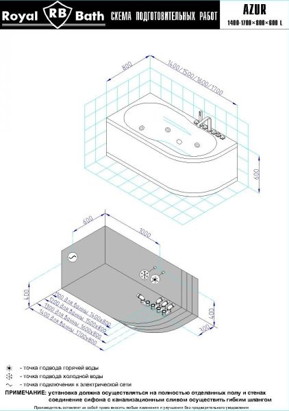 Гидромассажная ванна Royal Bath Azur Standart 140x80см левая белый RB614200ST-L