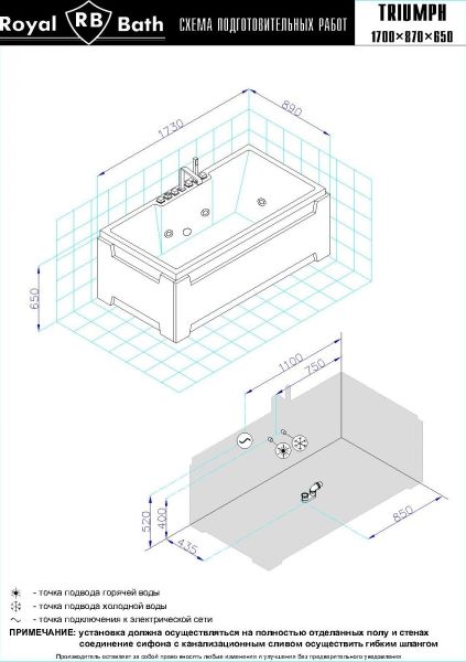 Акриловая ванна Royal Bath - идеальный выбор для создания атмосферы релакса и умиротворения, как в просторной в ванной комнате, так и в комнатном санузле. Основным преимуществом ванны из акрила считается её малый вес, высокая гигиеничность данного материала и низкая теплопроводность, долго сохраняющая комфортную температуру воды.Форма ванны Royal Bath замечательно подойдет к любому интерьерному решению, в различных вариантах размещения внутри ванной комнаты. Пристенная установка - это наиболее традиционный вид установки, а при использовании декоративного экрана пространство под ванной можно использовать как место хранения моющих средств. Оптимальная глубина позволяет принимать ванну с максимальным комфортом и полным расслаблением. Ванна Royal Bath выполнена со строгим соблюдением всех значительных элементов современного стиля.Благодаря тому, что родина бренда Royal Bath - Россия, можно смело быть уверенным в непревзойденном качестве и долговечности ванны, так как производство полностью соответствует стандартам качества. Акриловая ванна Royal Bath - это незаменимый, основной элемент любой ванной комнаты, без которого невозможно обойтись, ни в многоквартирном доме, ни в загородном коттедже.Комплектация гидромассажной ванны:- акриловая ванна Triumph 170х87х65 в сборе;- гидромассажная система на 6 форсунок;- аэромассаж с хромотерапией на 8 форсунок;- cмеситель на борт ванны RB Triumph 501;- слив-перелив для ванны полуавтомат 80 см.Ожидаемый срок поставки 7 дней.Обратите внимание: данная позиция поставляется под заказ! Товар поставляется по 100%-ной предоплате.Данный товар является заказным и имеет индивидуально-определенные свойства.