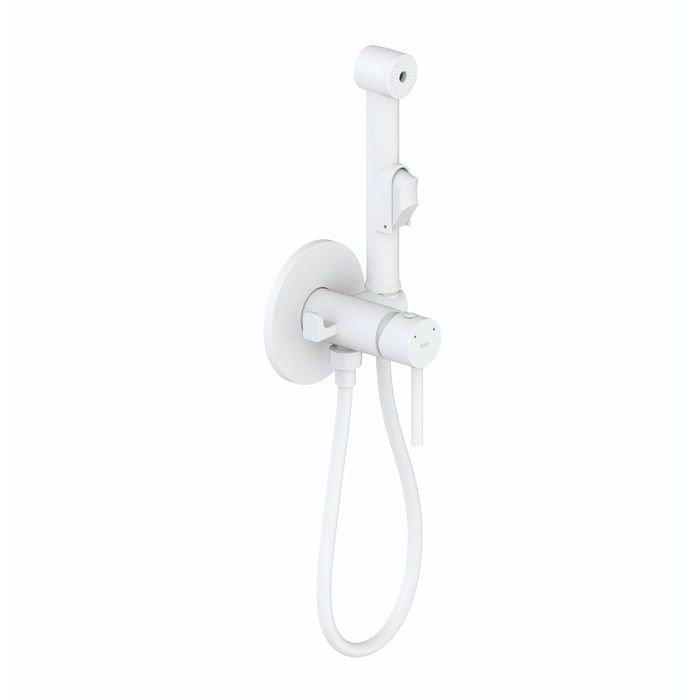 Встраиваемый смеситель с гигиеническим душем со стильным белым матовым покрытием подойдет для современной туалетной комнаты, привнесет в нее комфорт и эстетику. Крючок на корпусе смесителя позволит разместить полотенце – оно будет всегда под рукой. Держатель для лейки и крючок для полотенца при необходимости можно поменять местами. Гигиеническая лейка и гладкий душевой шланг длиной 1,2 метра в комплекте.