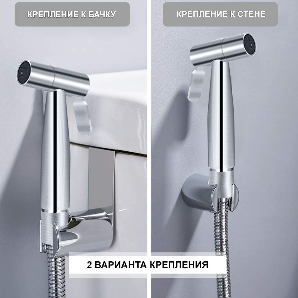 Гигиенический набор в цвете хром: гигиенический душ d25 мм (1 режим) на гибком шланге 120 см с защитой от перекручивания. В комплекте настенный держатель и держатель на край бочка.