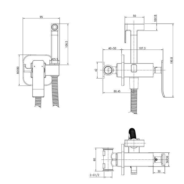 - Аксессуары в комплекте: лейка для биде с нажимным механизмом, шланг 1,2 м