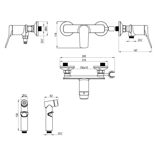 - Аксессуары в комплекте: лейка гигиенического душа с регулятором напора воды, душевой шланг 1,2 м