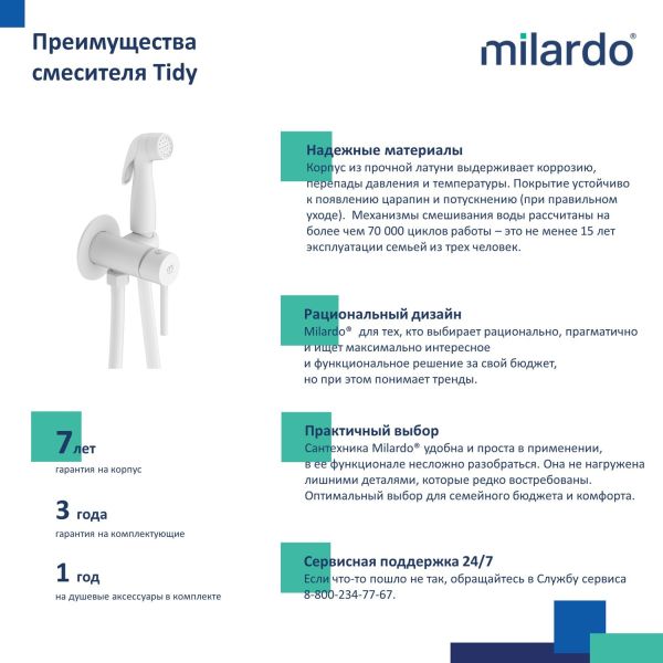 Новая коллекция цветных смесителей Tidy – это современное готовое решение для гигиенического душа. Модный дизайн и беловое матовое покрытие придают смесителю актуальный внешний вид, а удобное рычажное управление, позволяет управлять им в одно движение. Легкость управления получится прочувствовать уже с первого прикосновения. Гигиеническая лейка из ABS-пластика и душевой шланг из ПВХ (1,2) в комплекте. • Мы серьезно относимся к безопасности вашего здоровья: материалы смесителей Milardo® не содержат вредных веществ, соответствуют ГОСТам и гигиеническим требованиям. • В смесителях Milardo® установлены надежные механизмы и комплектующие. Будьте уверены: они не дадут течь, а, значит, смеситель не навредит имуществу. • Гарантия на смесители Milardo® – 7 лет. Гарантия на лейку и шланг – 3 года. (с) Авторский текст, апрель 2021 г.