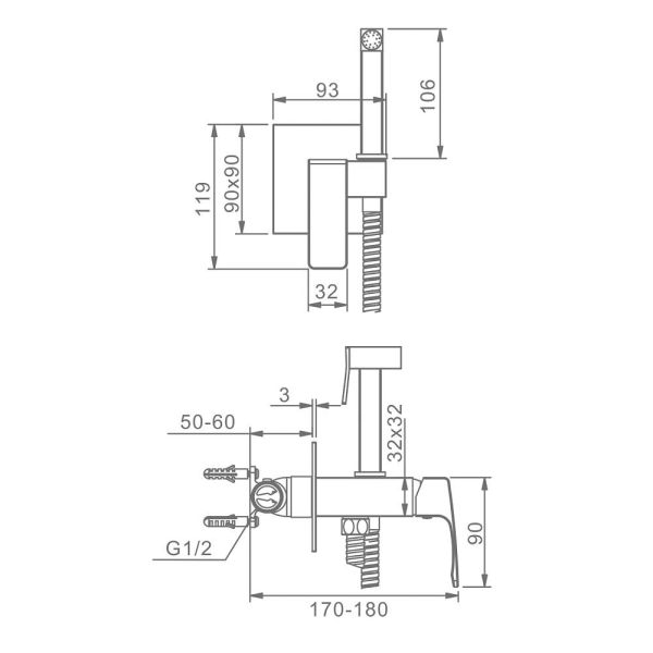 Качественный и современный смеситель с гигиеническим душем R01.52, одна рукоять для того, чтобы регулировать напор воды. Смеситель для биде устанавливается прямо внутрь стены, что позволит скрыть функциональные элементы, спрятать некоторые элементы монтажа. Латунная душевая лейка работает в одном режиме. Высокопрочный душевой шланг 1200 мм в оплетке двойного вальцевания с трубкой из синтетического каучука вращающийся на 360 градусов. Основной материал корпуса - латунь, проверенный временем материал, который обеспечивает идеальное напыление хромированного покрытия. Квадратная форма душ для биде делает его оригинальным и аутентичным.