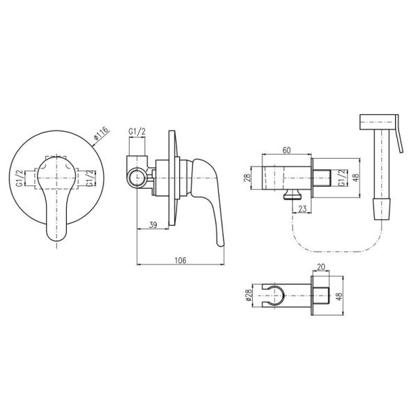 Комплектация: смеситель, лейка, шланговое подключение с держателем лейки, шланг, внутренняя часть