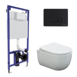 Полный комплект BERGES для монтажа подвесного унитаза. 1. Инсталляция NOVUM525Толщина бачка 80 мм.Межосевое расстояние под крепежные шпильки унитаза 18 и 23 см.Резервуар воды объемом 10 литров с тепло-шумоизоляцией.Уровень шума при давлении 3 бар не превышает 13 дБ.Подвод воды сверху (G1/2 наружная).Объем смыва 3/6 литра с возможностью регулировки. Металлический каркас, окрашенный антикоррозийной эмалью, расчетная нагрузка до 400 кг.Ножки регулировки высоты из оцинкованной стали. Возможность установки в угол. 2. кнопка D5 черная Soft TouchABS-пластик 3. унитаз , VENTAS Rimlessбезободковая система смыва, антибактериальное покрытиеэкономия воды, скрытый крепеж 4. сиденье дюропласт Ventas Slim SOмикролифт, быстросъем Все крепежи для установки в комплекте