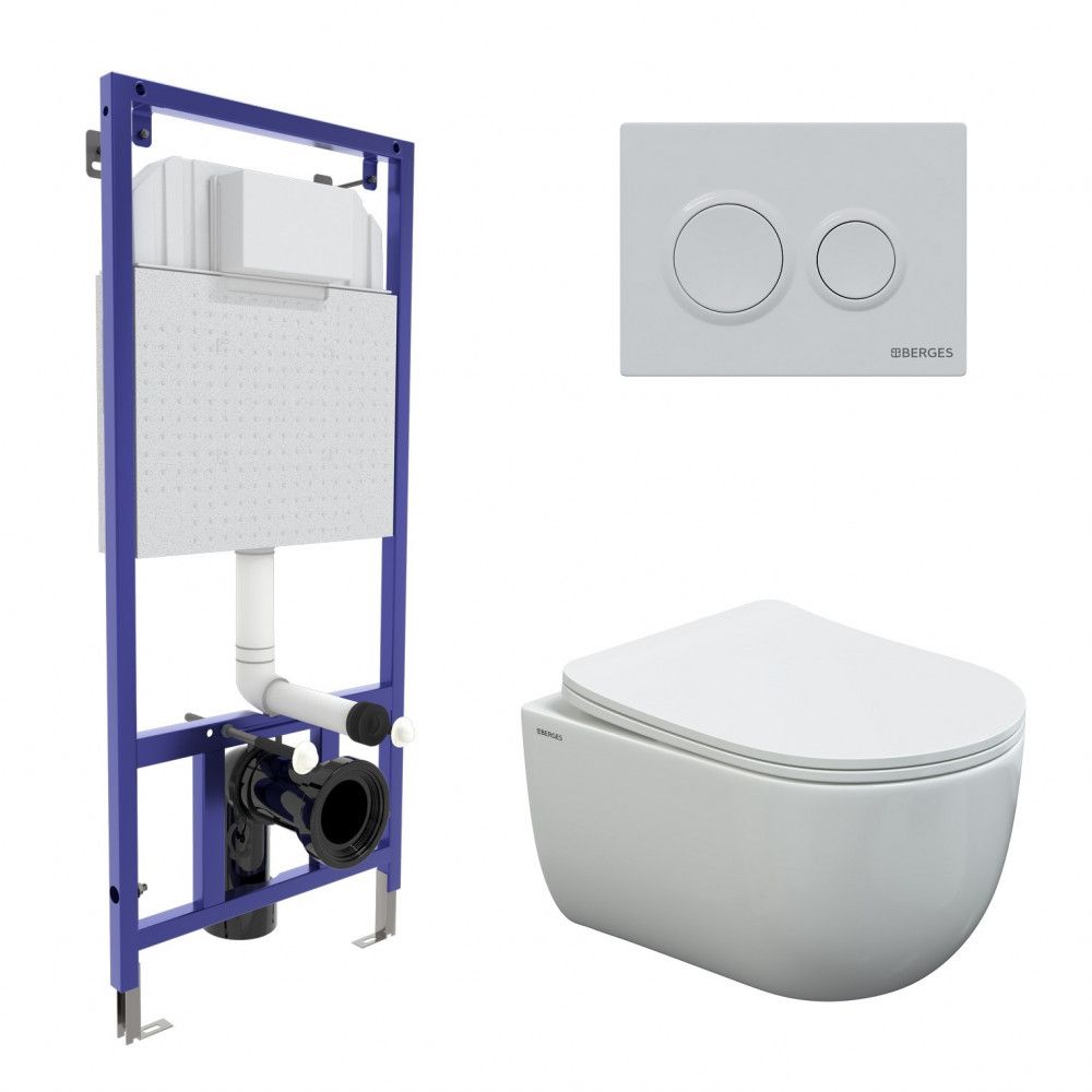 Полный комплект BERGES для монтажа подвесного унитаза. 1. Инсталляция NOVUM525Толщина бачка 80 мм.Межосевое расстояние под крепежные шпильки унитаза 18 и 23 см.Резервуар воды объемом 10 литров с тепло-шумоизоляцией.Уровень шума при давлении 3 бар не превышает 13 дБ.Подвод воды сверху (G1/2 наружная).Объем смыва 3/6 литра с возможностью регулировки. Металлический каркас, окрашенный антикоррозийной эмалью, расчетная нагрузка до 400 кг.Ножки регулировки высоты из оцинкованной стали. Возможность установки в угол. 2. кнопка О1 белаяABS-пластик 3. унитаз , VENTAS Rimlessбезободковая система смыва, антибактериальное покрытиеэкономия воды, скрытый крепеж 4. сиденье дюропласт Ventas Slim SOмикролифт, быстросъем Все крепежи для установки в комплекте