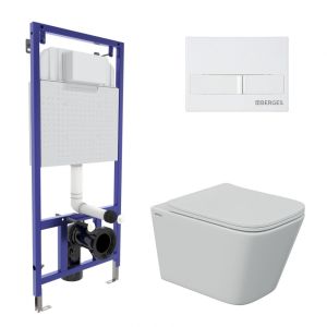 Полный комплект BERGES для монтажа подвесного унитаза. 1. Инсталляция NOVUM525Толщина бачка 80 мм.Межосевое расстояние под крепежные шпильки унитаза 18 и 23 см.Резервуар воды объемом 10 литров с тепло-шумоизоляцией.Уровень шума при давлении 3 бар не превышает 13 дБ.Подвод воды сверху (G1/2 наружная).Объем смыва 3/6 литра с возможностью регулировки. Металлический каркас, окрашенный антикоррозийной эмалью, расчетная нагрузка до 400 кг.Ножки регулировки высоты из оцинкованной стали. Возможность установки в угол. 2. кнопка L1 белаяABS-пластик 3. унитаз , FLOE S Rimlessбезободковая система смыва, антибактериальное покрытиеэкономия воды, скрытый крепеж 4. сиденье дюропласт Floe S Slim SOмикролифт, быстросъем Все крепежи для установки в комплекте