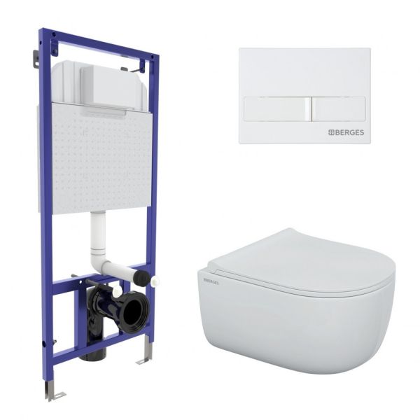 Полный комплект BERGES для монтажа подвесного унитаза. 1. Инсталляция NOVUM525Толщина бачка 80 мм.Межосевое расстояние под крепежные шпильки унитаза 18 и 23 см.Резервуар воды объемом 10 литров с тепло-шумоизоляцией.Уровень шума при давлении 3 бар не превышает 13 дБ.Подвод воды сверху (G1/2 наружная).Объем смыва 3/6 литра с возможностью регулировки. Металлический каркас, окрашенный антикоррозийной эмалью, расчетная нагрузка до 400 кг.Ножки регулировки высоты из оцинкованной стали. Возможность установки в угол. 2. кнопка L1 белая 3. унитаз EGO Rimless,безободковая система смыва, антибактериальное покрытиеэкономия воды, скрытый крепеж 4. сиденье дюропласт Okus Slim SOмикролифт, быстросъем. Все крепежи для установки в комплекте