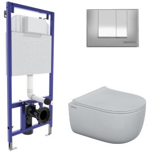 Полный комплект BERGES для монтажа подвесного унитаза. 1. Инсталляция NOVUM525Толщина бачка 80 мм.Межосевое расстояние под крепежные шпильки унитаза 18 и 23 см.Резервуар воды объемом 10 литров с тепло-шумоизоляцией.Уровень шума при давлении 3 бар не превышает 13 дБ.Подвод воды сверху (G1/2 наружная).Объем смыва 3/6 литра с возможностью регулировки. Металлический каркас, окрашенный антикоррозийной эмалью, расчетная нагрузка до 400 кг.Ножки регулировки высоты из оцинкованной стали. Возможность установки в угол. 2. кнопка S3 хром глянецABS-пластик 3. унитаз EGO Rimless,безободковая система смыва, антибактериальное покрытиеэкономия воды, скрытый крепеж 4. сиденье дюропласт Toma Slim SOмикролифт, быстросъем. Все крепежи для установки в комплекте