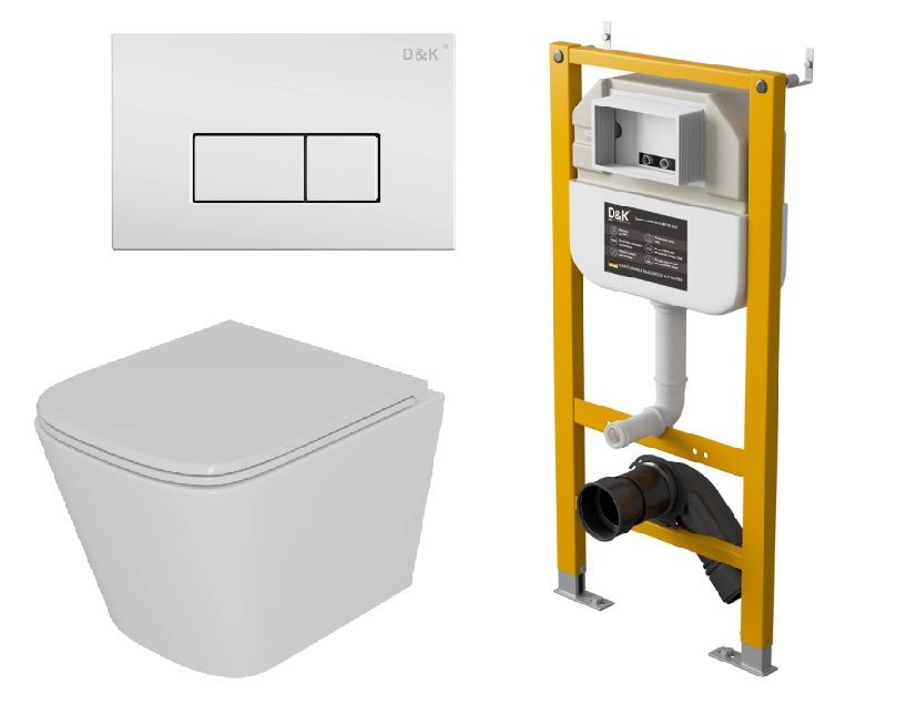 Комплект Унитаз подвесной безободковый (торнадо) DQ Berlin DT1436516, 490*340*350мм, сиденье микролифт, белый+Инсталляция рамная скрытого монтажа DQ DI8050127, 500*117*1270мм, для подвесного унитаза, универсальная+Клавиша смыва DQ Rhein DB1499016, белый