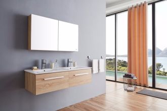 1. Многослойное дерево, 2. Два выдвижных ящика с доводчиками 3. Цвет: светлый дуб. 4. Зеркальный шкаф 5.Раковина в комплекте.