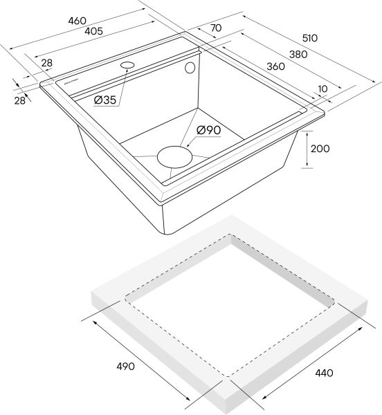 Материал мойки устойчив к сколам, царапинам и деформациям. На горизонтальных гранях чаши мойки предусмотрены специальные выступы-ступеньки, которые позволяют использовать такие аксессуары, как ролл-маты, доски, коландеры и прочие для создания дополнительной рабочей поверхности на кухне. Дно чаши мойки имеет 4 грани, направленных к сливу под индивидуальным градусом для максимально быстрого ухода воды.