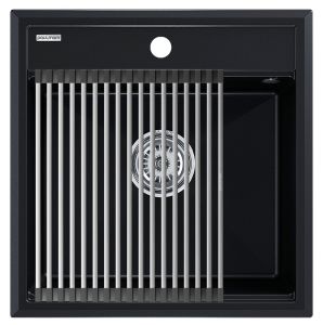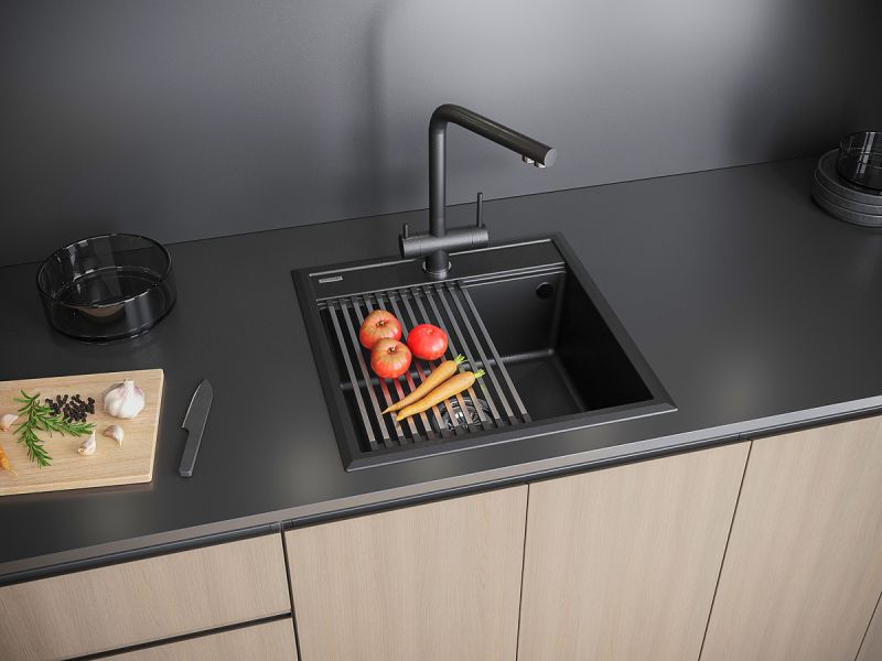 Комплект мойка STEPIA 50 + ролл-мат STEP, PM115051-BLM+R375-BSСтильный и многофункциональный комплект мойки из композитного материала на основе гранита и ролл-мата из высококачественной нержавеющей стали для создания комфортной рабочей зоны на вашей кухне.Мойка STEPIA 50 изготовлена из IT-GRANIT – композитного материала на основе гранита, благодаря чему мойка не потеряет свой первоначальный цвет за многие годы использования даже при длительном воздействии солнечных лучей. Материал мойки устойчив к сколам, царапинам и деформациям. На горизонтальных гранях чаши мойки предусмотрены специальные выступы-ступеньки, которые позволяют использовать такие аксессуары, как ролл-маты, доски, коландеры и пр. для создания дополнительной рабочей поверхности на кухне. Дно чаши мойки имеет 4 грани, направленных к сливу под индивидуальным градусом для максимально быстрого ухода воды.