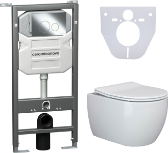 Сет 4 в 1: CN3001_1001CH_1000Подвесной унитаз PLAY Rimless арт. CN3001Шумоизоляционная панель для инсталляции арт. CN1000Система инсталляции для унитазов CERAMICANOVA Envision с кнопкой смыва Round цвет хром и креплениями, арт. CN1001CHПодвесной безободковый унитаз Ceramica Nova Play Rimless, крышка микролифт, CN3001