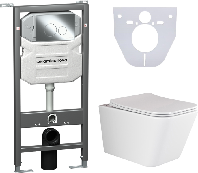 Сет 4 в 1: CN3007_1001CH_1000Подвесной унитаз Metric Rimless арт. CN3007Шумоизоляционная панель для инсталляции арт. CN1000Система инсталляции для унитазов CERAMICANOVA Envision с кнопкой смыва Round цвет хром и креплениями, арт. CN1001CH Подвесной безободковый унитаз Ceramica Nova Metric Rimless, крышка микролифт, CN3007