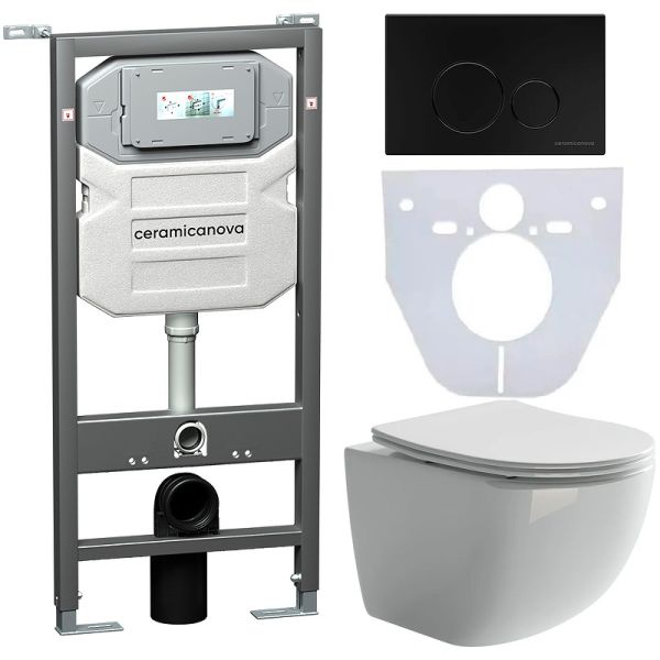 Сет 4 в 1: CN3009_1001B_1000Подвесной унитаз Forma Rimless арт. CN3009Шумоизоляционная панель для инсталляции арт. CN1000Система инсталляции для унитазов CERAMICANOVA Envision с кнопкой смыва Round цвет чёрный матовый и креплениями, арт. CN1001B