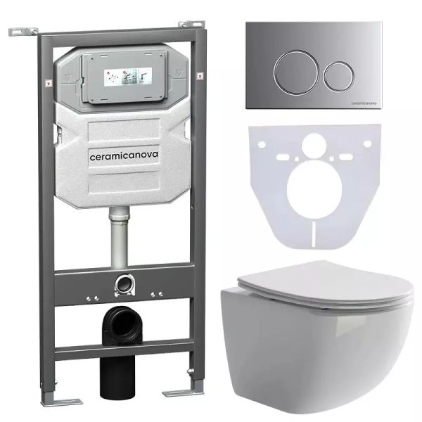 Сет 4 в 1: CN3009_1001M_1000Подвесной унитаз Forma Rimless арт. CN3009Шумоизоляционная панель для инсталляции арт. CN1000Система инсталляции для унитазов CERAMICANOVA Envision с кнопкой смыва Round цвет хром матовый и креплениями, арт. CN1001M Подвесной унитаз Forma Rimless CN3009, глубокий смыв, с крепежом для полностью скрытого монтажа, ультра тонким с сидением и крышкой с функцией плавного закрытия, дюропласт.Шумоизоляционная панель для инсталляции CN1000