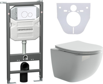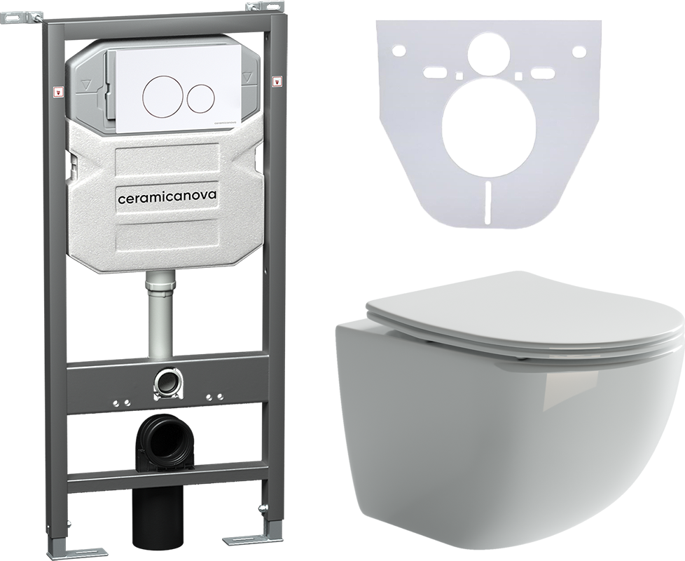 Сет 4 в 1: CN3009_1001W_1000Подвесной унитаз Forma Rimless арт. CN3009Шумоизоляционная панель для инсталляции арт. CN1000Система инсталляции для унитазов CERAMICANOVA Envision с кнопкой смыва Round цвет белый и креплениями арт. CN1001W Подвесной унитаз Ceramica Nova Forma Rimless CN3009 безободковый, с сиденьем Soft Close