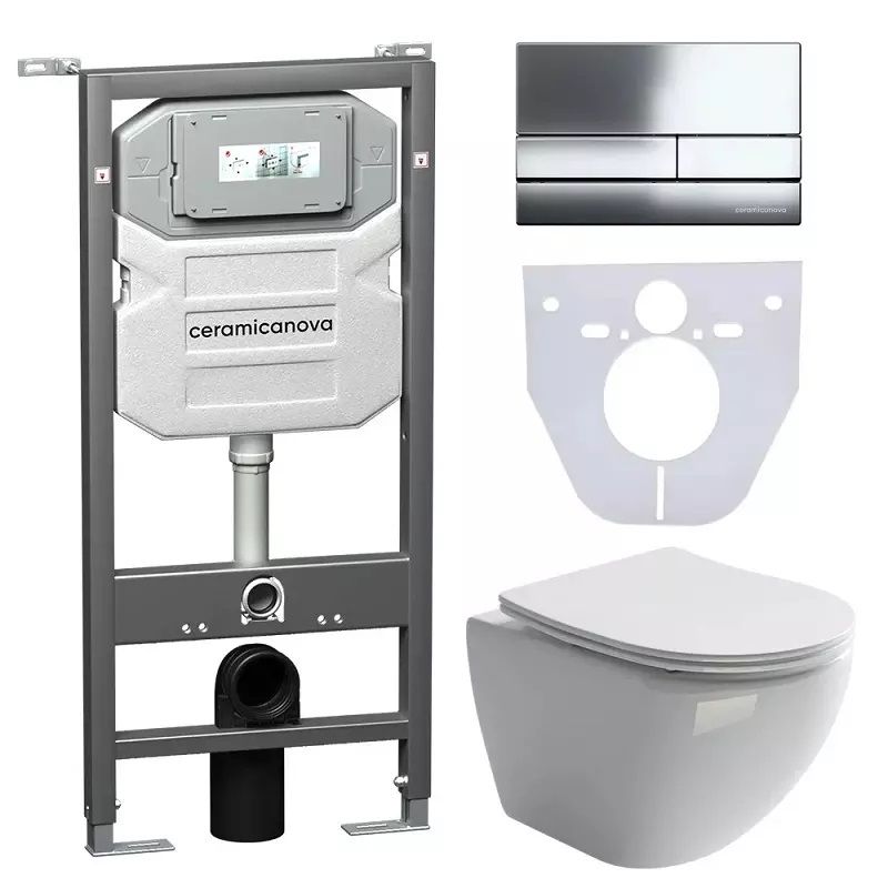 Сет 4 в 1: CN4002_1002CH_1000Подвесной унитаз Metropol Rimless арт. CN4002Шумоизоляционная панель для инсталляции арт. CN1000Система инсталляции для унитазов CERAMICANOVA Envision с кнопкой смыва Flat цвет хром, креплениями, арт. CN1002CH Подвесной унитаз Metropol Rimless CN4002, глубокий смыв, с крепежом для полностью скрытого монтажа, ультра тонким с сидением и крышкой с функцией плавного закрытия, дюропласт.