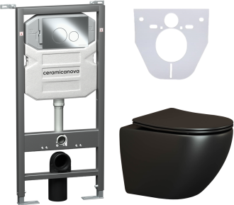 Сет 4 в 1: CN4002MB_1001CH_1000Подвесной унитаз Metropol Rimless арт. CN4002MBШумоизоляционная панель для инсталляции арт. CN1000Система инсталляции для унитазов CERAMICANOVA Envision с кнопкой смыва Round цвет хром и креплениями, арт. CN1001CH Подвесной безободковый унитаз Ceramica Nova Metropol Rimless черный матовый, сиденье микролифт, CN4002MB