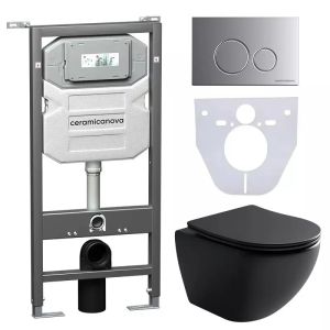 Сет 4 в 1: CN4002MB_1001M_1000Подвесной унитаз Metropol Rimless арт. CN4002MBШумоизоляционная панель для инсталляции арт. CN1000Система инсталляции для унитазов CERAMICANOVA Envision с кнопкой смыва Round цвет хром матовый и креплениями, арт. CN1001M Подвесной унитаз Metropol Rimless CN4002MB, глубокий смыв, с крепежом для полностью скрытого монтажа, ультра тонким с сидением и крышкой с функцией плавного закрытия, дюропласт.Шумоизоляционная панель для инсталляции CN1000
