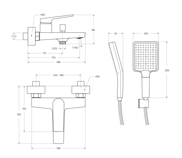 Душевая лейка, душевой шланг, держатель душевой лейки