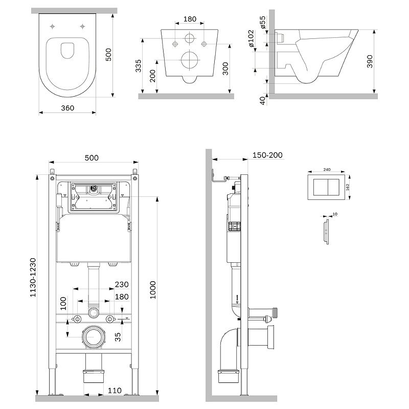 Полностью готовый к установке комплект: система инсталляции с клавишей, подвесной унитаз с сиденьем, включающий все необходимые крепления, патрубки, звукоизолирующую прокладку. Экономия пространства благодаря узкому бачку - 120 мм глубиной. Заливной клапан с низким уровнем шума - Класс II, согласно европейского стандарта EN 14124.