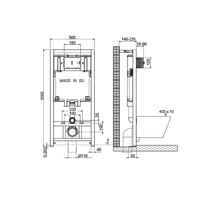 Инсталляция для унитаза. Рама инсталляции изготовлена из стали и покрыта прочной порошковой антикоррозионной краской. Отличительная особенность данной системы инсталляции - возможность регулировки по высоте на 20 см с помощью ножек из оцинкованной стали. Бачок скрытого монтажа выполнен из полимерного материала HDPE, что соответствует ведущим Европейским стандартам. Для защиты от конденсата, а также обеспечения бесшумной работы, резервуар скрытого монтажа обшит пенопластом.