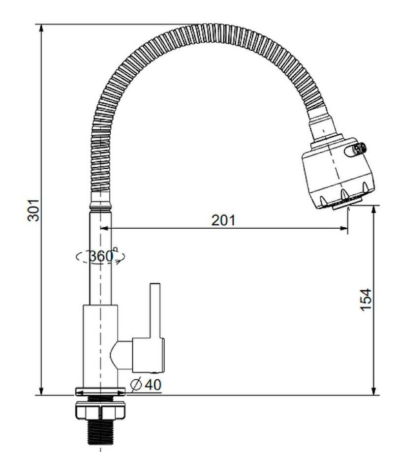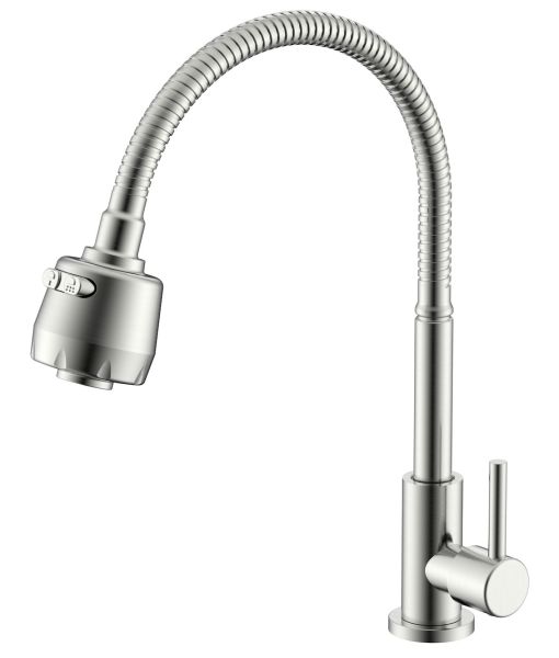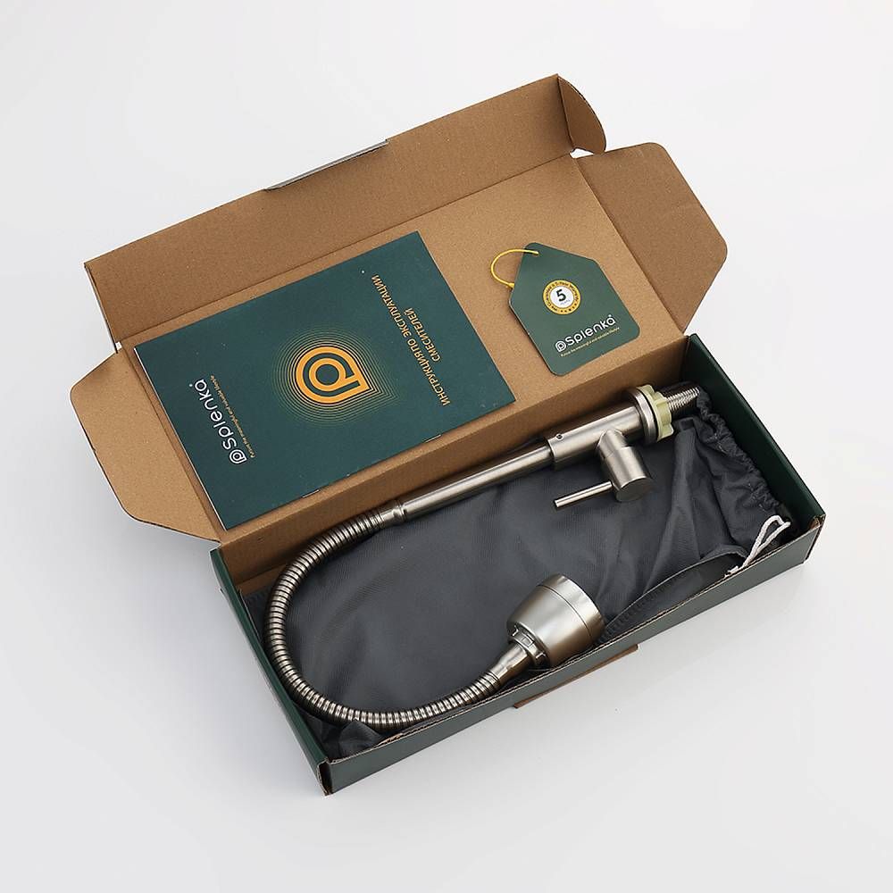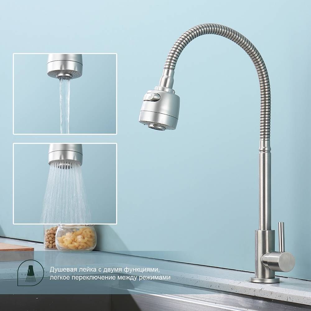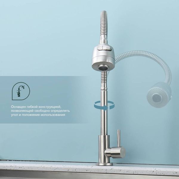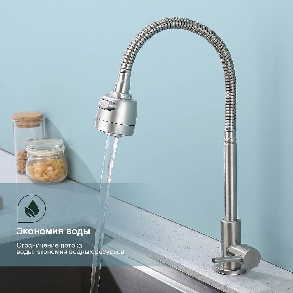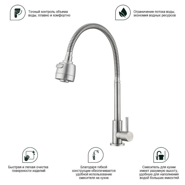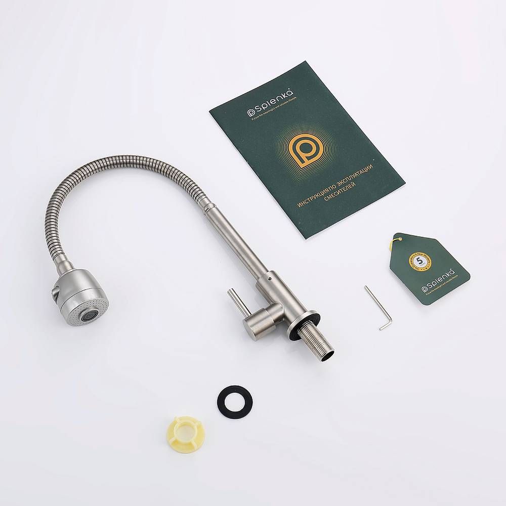 Кран для одного типа воды Splenka S249.482.05. Материал: нержавеющая сталь. Управление: однорычажное. Механизм: керамическая кран-букса. Излив: поворотный. Стандарт подводки: G 1/2. Тип подводки: гибкая. Аэратор. Монтаж: на мойку.