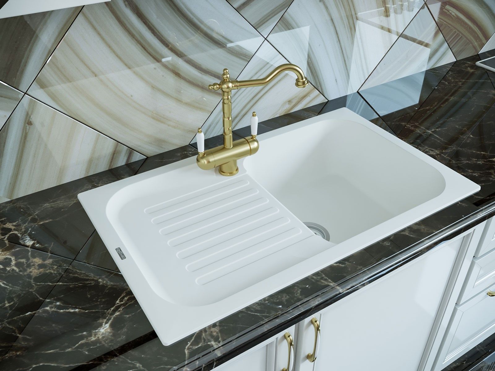 В комплектацию входит: отводная арматура с выпуском и переливом, крепежи, и шаблон для выреза на столешнице.