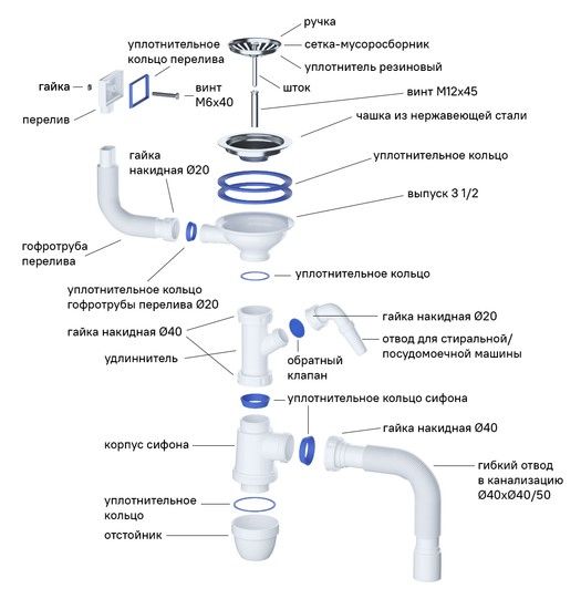 Есть все для монтажа: выпуск, сифон, уплотнительная лента, крепеж.