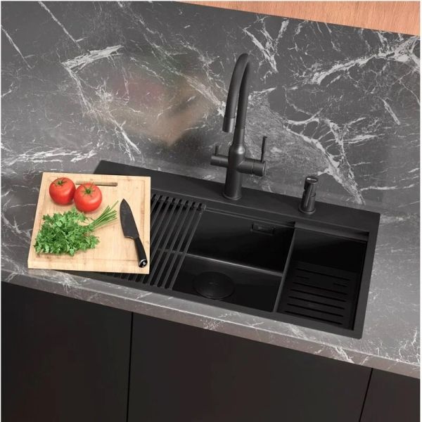 Мойка в комплекте с аксессуарами включает ролл-мат, коландер и разделочную доску, а ее ступенчатая форма позволяет устанавливать эти предметы прямо внутри чаши.