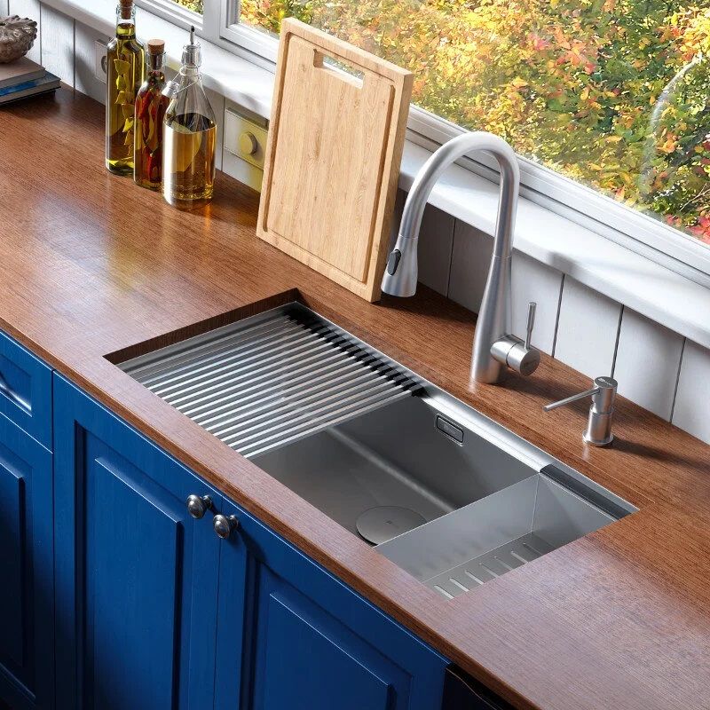 К мойке прилагаются практичные аксессуары: ролл-мат, который прекрасно подходит для сушки посуды и хранения влажных губок; коландер для размораживания продуктов и разделочная доска для резки ингредиентов.