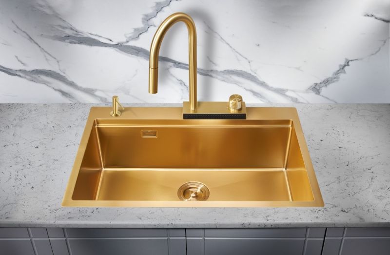 Мойка для кухни Milacio Denia 75 Steel MC.77428 в комплекте со смесителем и коландером брашированное золото купить