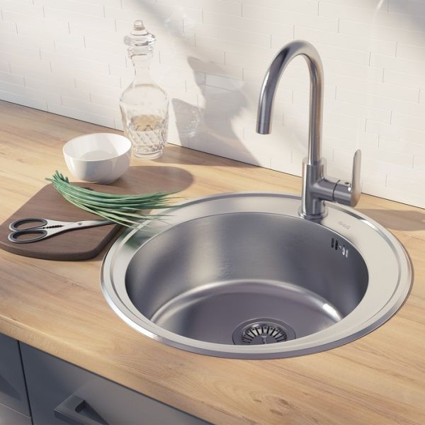 Универсальная круглая стальная мойка Basic с матовой сатиновой поверхностью диаметром 51 см и глубиной 18 см.