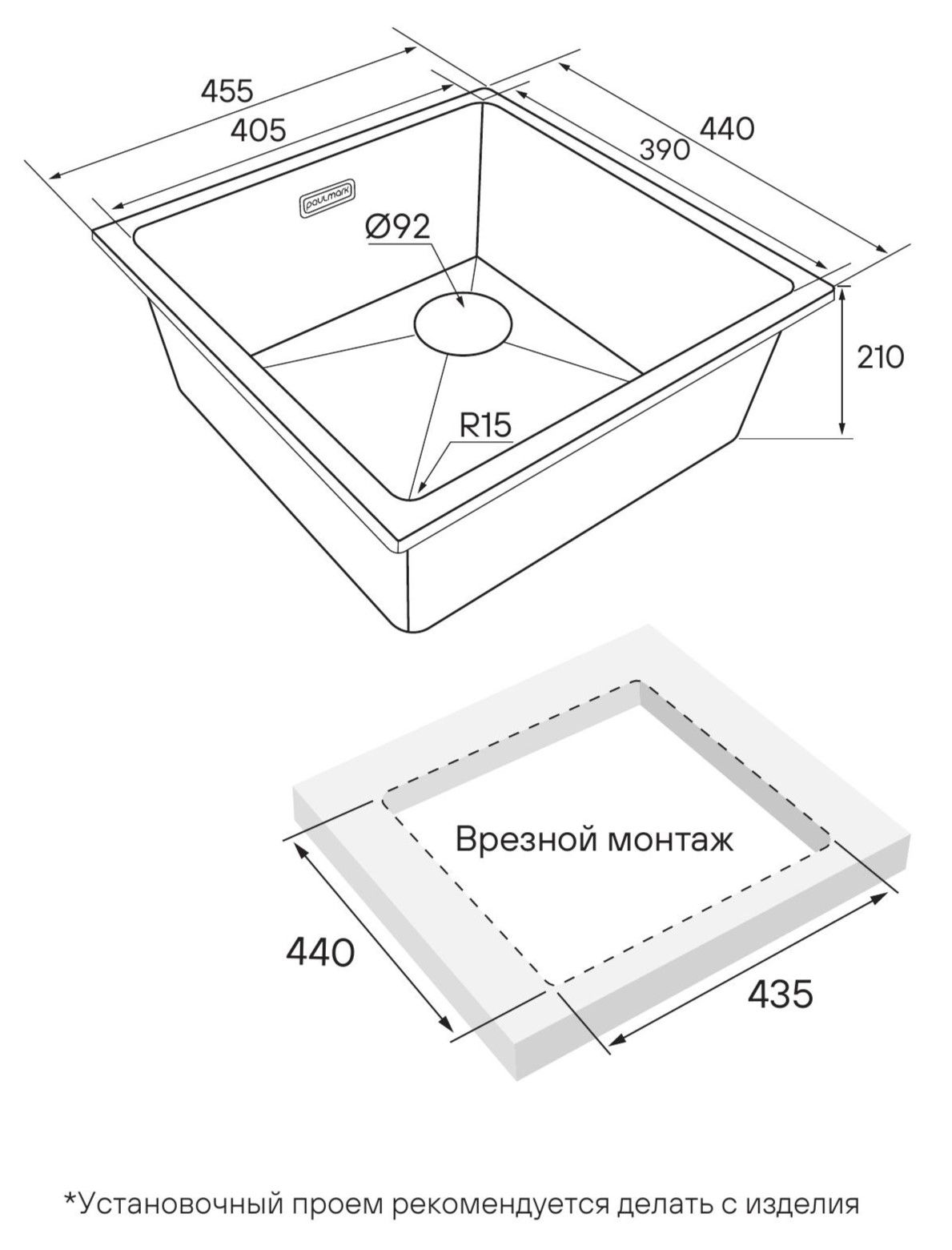 Мойка создана как для современного способа монтажа под столешницу, так и для классического врезного монтажа.