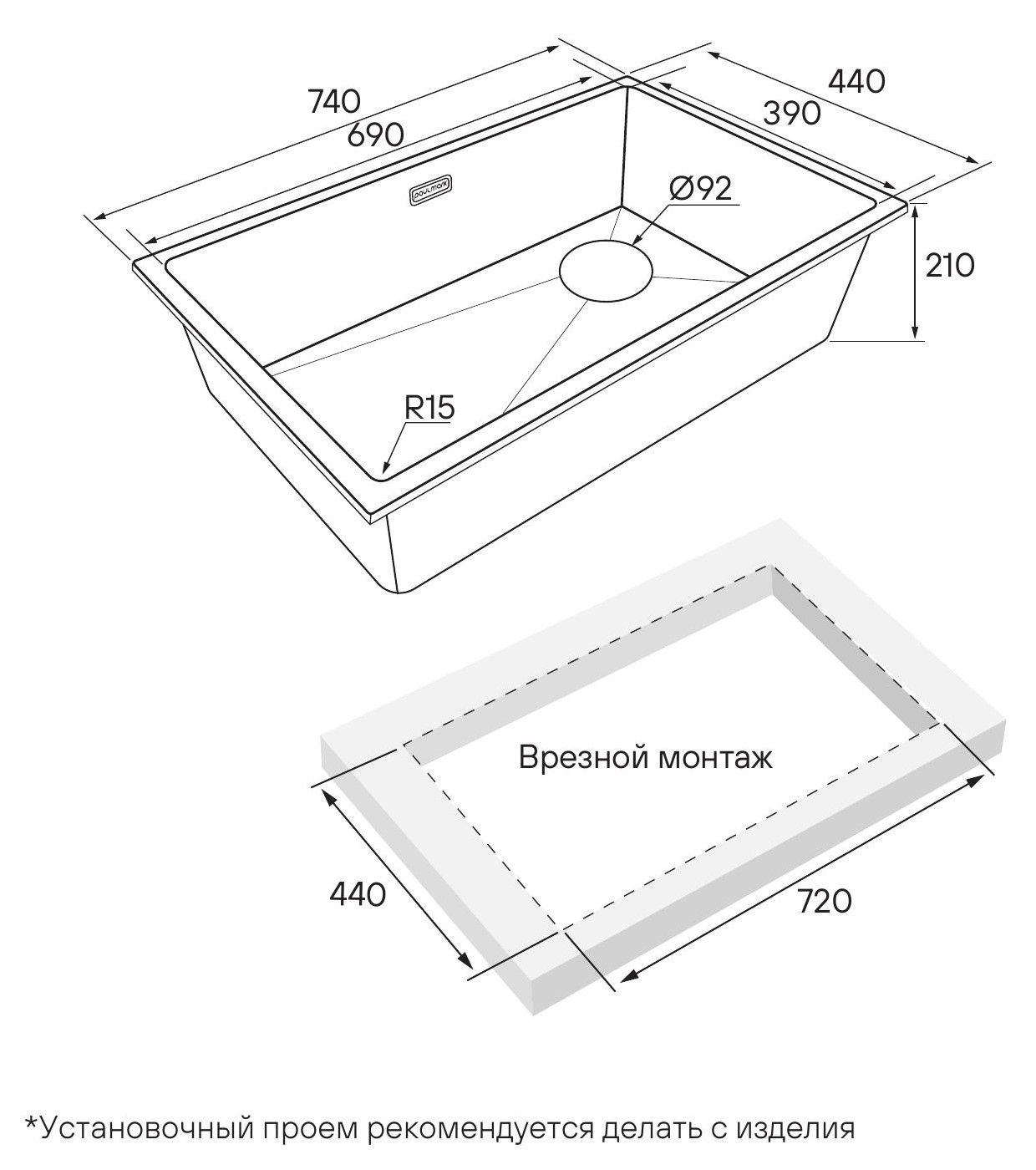 Мойка создана как для современного способа монтажа под столешницу, так и для классического врезного монтажа.