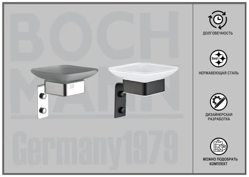 Ванная комната является одним из любимых и часто посещаемых мест человека. Мы проводим там больше 14 тысяч часов за всю жизнь, поэтому она обязательно должна быть не только уютной, но и эргономичной. Ни одна ванная комната не может обойтись без аксессуаров - незаметных на первый взгляд, но совершенно необходимых вещей, которые делают жизнь нашу намного комфортней. Они не только практичны, но и создают общую атмосферу ванной комнаты, придают ей индивидуальность и шарм.Дизайнерские аксессуары BOCH MANN стилистически завершают образ ванной комнаты, создавая целостную и продуманную концепцию. Их функциональный дизайн позволяет дополнить практически любой интерьер, а широкий ассортимент предоставляет свободу выбора. Так как срок службы аксессуаров для ванных и туалетных комнат напрямую зависит от материала, из которого они изготовлены, в производстве аксессуаров BOCH MANN используются только материалы самого высокого качества – нержавеющая сталь и закалённое стекло. Изделия из нержавеющей стали — рекордсмены по сроку службы, сохранению отличного внешнего вида и высоких эксплуатационных характеристик. Надежность конструкций аксессуаров BOCH MANN, профессиональное крепление и прочность покрытия позволяют использовать изделия не только в домашних условиях, но также и в общественных местах, включая отели и рестораны. Безупречность исполнения каждой детали, точность даже в мелочах — это признаки истинной элитарности бренда BOCH MANN. Преимущества:- эстетический внешний вид;- высококачественные материалы – нержавеющая сталь, закаленное стекло;- тип крепления – скрытый, отличающийся повышенной надёжностью;- два варианта цветов – классический черный и универсальный хром;- чёткие формы каждой детали;- качество, проверенное годами. Внимание! Производитель оставляет за собой право вносить изменения в конструкцию и комплектацию моделей без предварительного уведомления!
