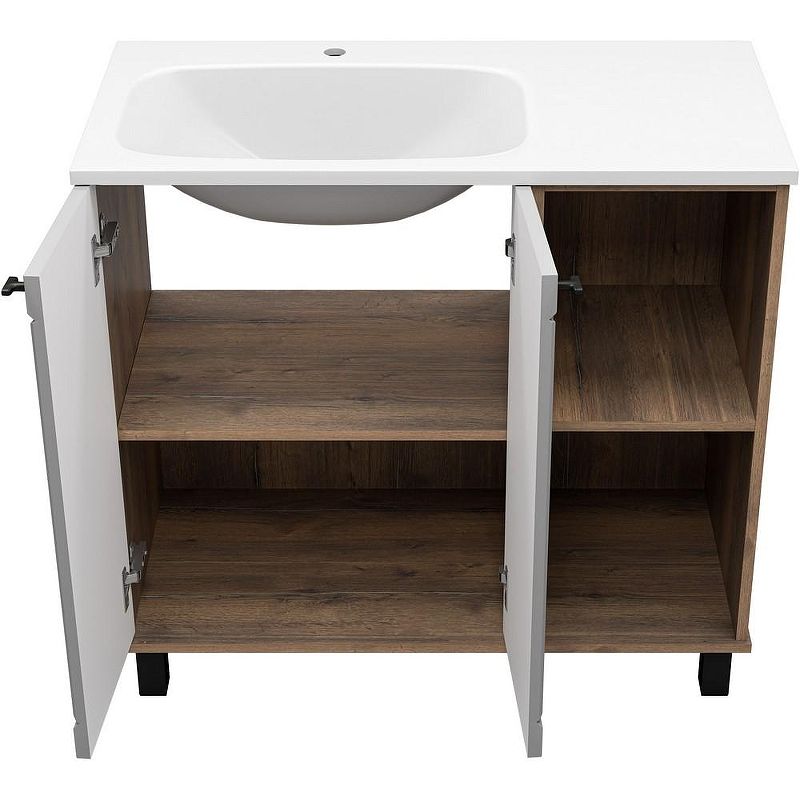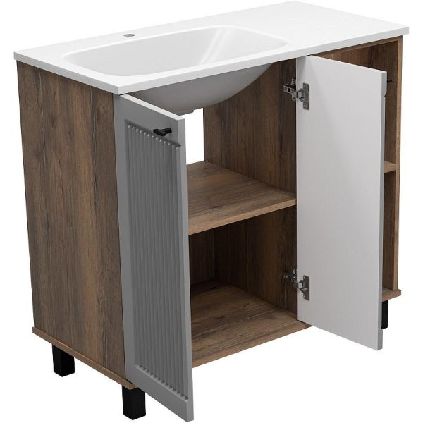 Тумба с раковиной Brevita Lumus 90 L УТ000025489 напольная с подсветкой. Lumus - свет, стиль и практичность. Коллекция Lumus создана для тех, кто ценит современные решения, функциональность и стильные акценты в интерьере. Особенность этой мебели - открытые ниши с подсветкой, которые не только создают уютную атмосферу, но и делают хранение удобнее. Контрастное сочетание оттенков придаёт коллекции выразительность: эмалированные фасады и корпус из ЛДСП идеально дополняют чёрные металлические ручки и регулируемые опоры. Все элементы продуманы до мелочей: петли с доводчиками гарантируют плавное закрывание дверей, а премиальные материалы обеспечивают долговечность и надёжность. Это мебель, которая смотрится эффектно в любом интерьере, подчёркивая внимание к деталям. Lumus - это больше, чем просто мебель. Это игра света и тени, стиль, который привлекает внимание, и комфорт, который ощущаешь каждый день. Характеристики: Тумба под раковину: