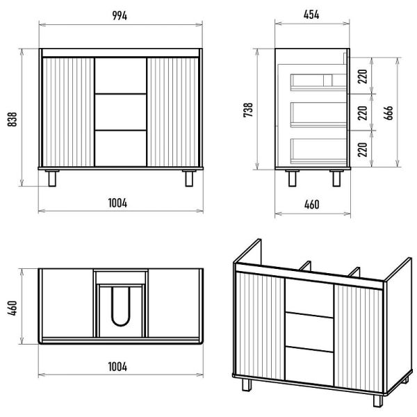 Габариты корпуса тумбы (ШхВхД): 1004х838х460 мм.