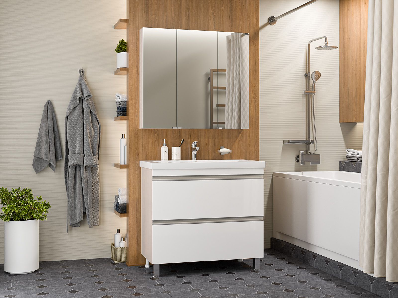 Напольная тумба под раковину – это не просто элемент мебели, но настоящее произведение искусства, которое сочетает в себе функциональность и изысканный дизайн. Изготовленная из высококачественных материалов, она гарантирует долговечность и устойчивость к воздействию влаги.Удобная система хранения позволяет размещать все необходимое для гигиенических процедур, а её продуманные размеры отлично вписываются даже в небольшие помещения. Стильные ручки и элегантные фасады придают тумбе особый шарм, а разнообразие цветовых решений позволит выбрать модель, соответствующую любому интерьеру – от классического до модерн.Мягкие линии и непринужденные формы делают тумбу неотъемлемой частью ванной, превращая её в любимое место для отдыха. Совершенное сочетание эстетики и практичности позволяет создать гармоничный и стильный интерьер, что делает напольную тумбу для ванной комнаты идеальным аксессуаром для любого дома.